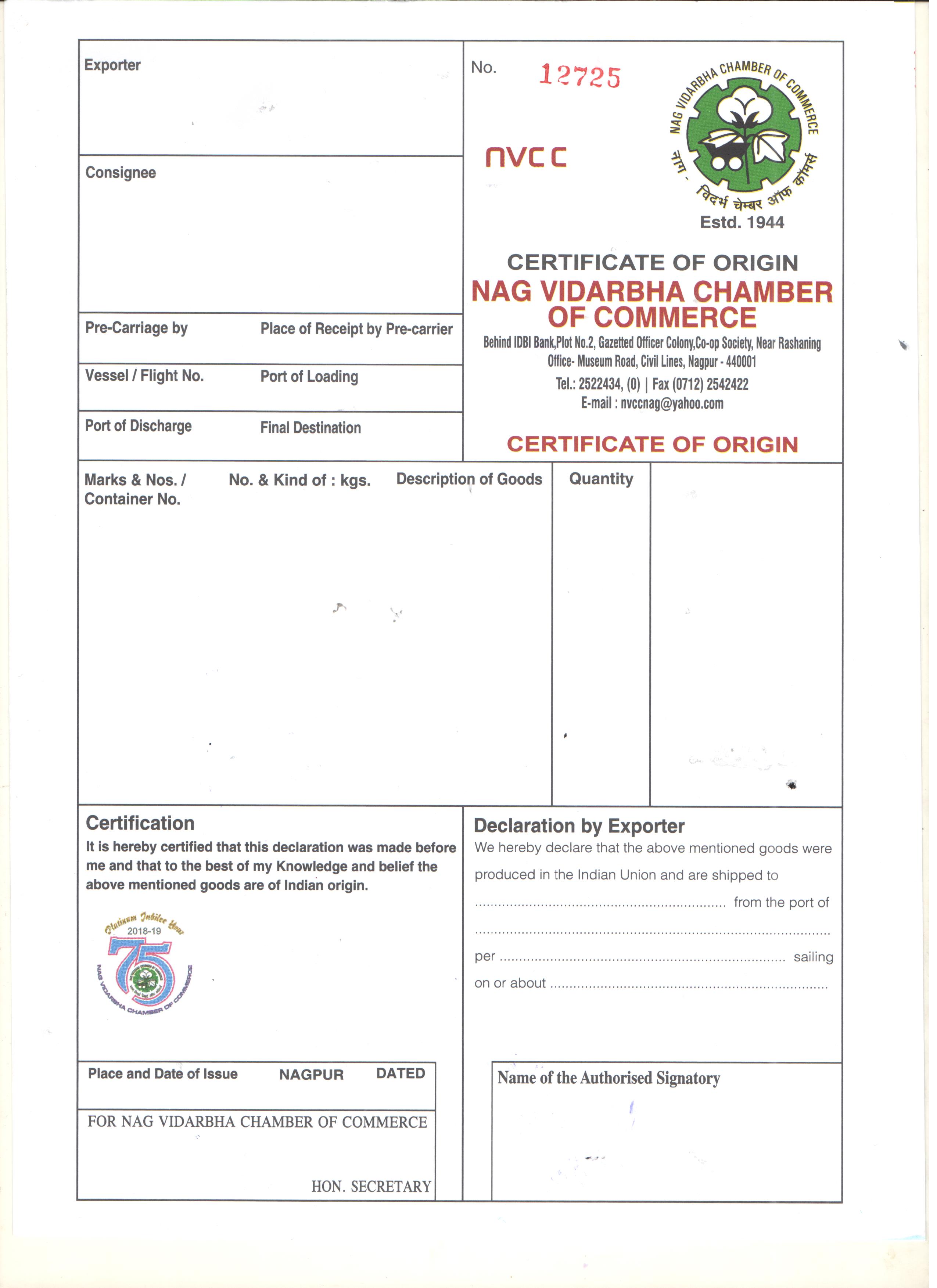 1. 4 Copies of Certificate of Origin duly filled in